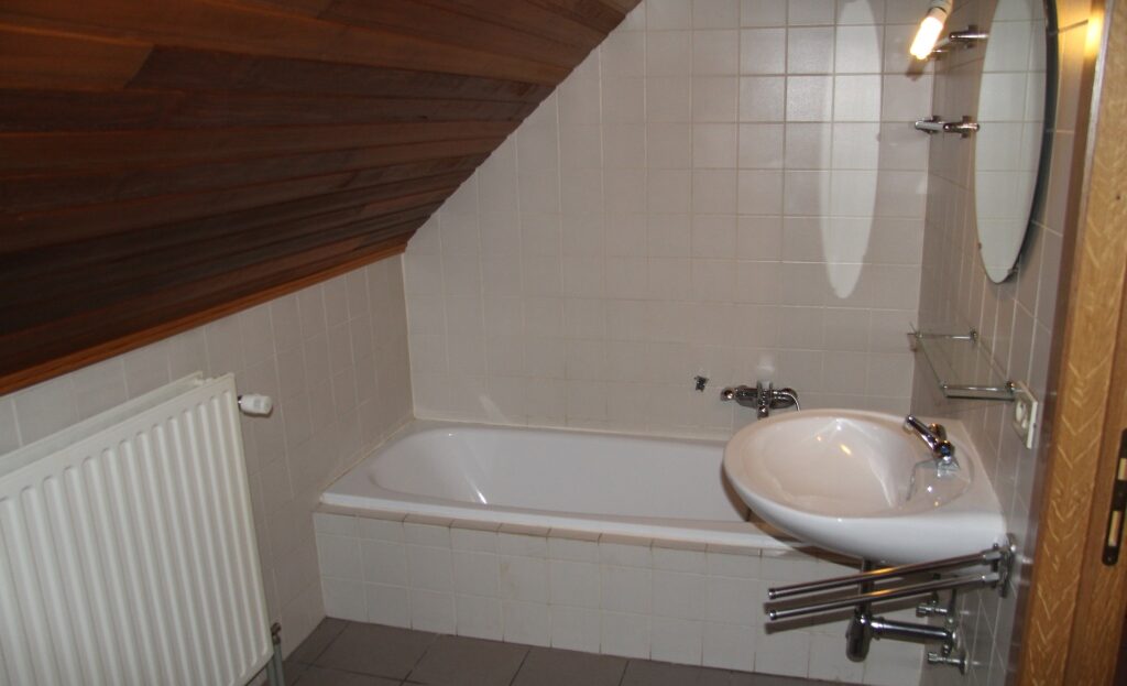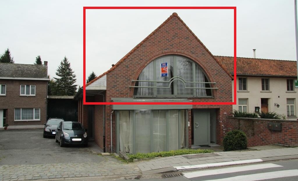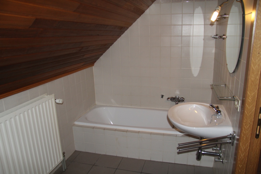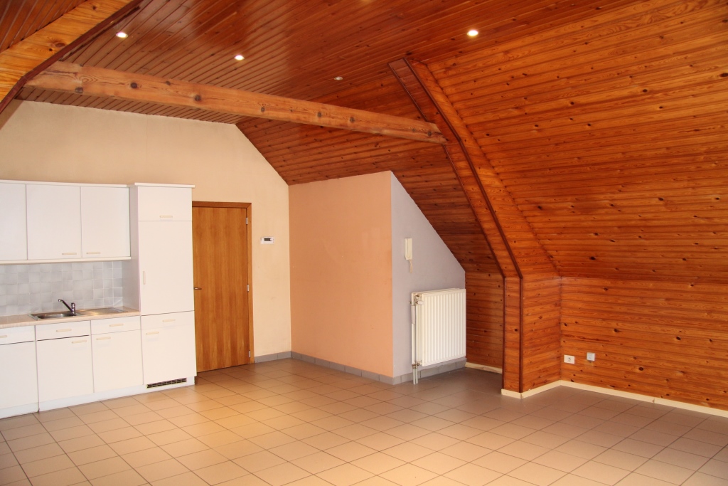 Appartementje op de 1e verdieping bestaande uit een inkomhalletje, living met open keuken (basic inrichting met kookplaat en dampkap), 2 slaapkamers, berging, badkamer met ligbad en lavabo, ruime zolderberging, niet overdekte autostaanplaats.